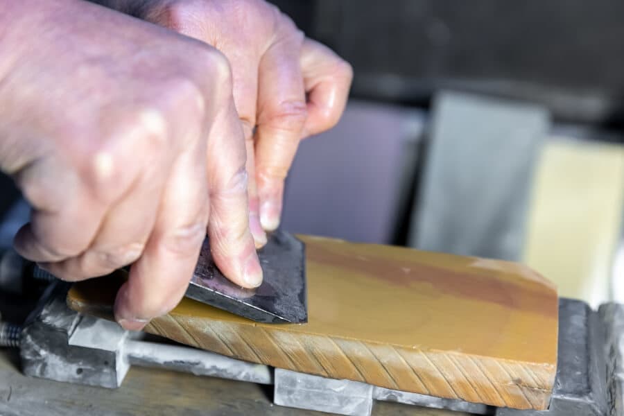 最適な角度を保ち、天然砥石を使用する。